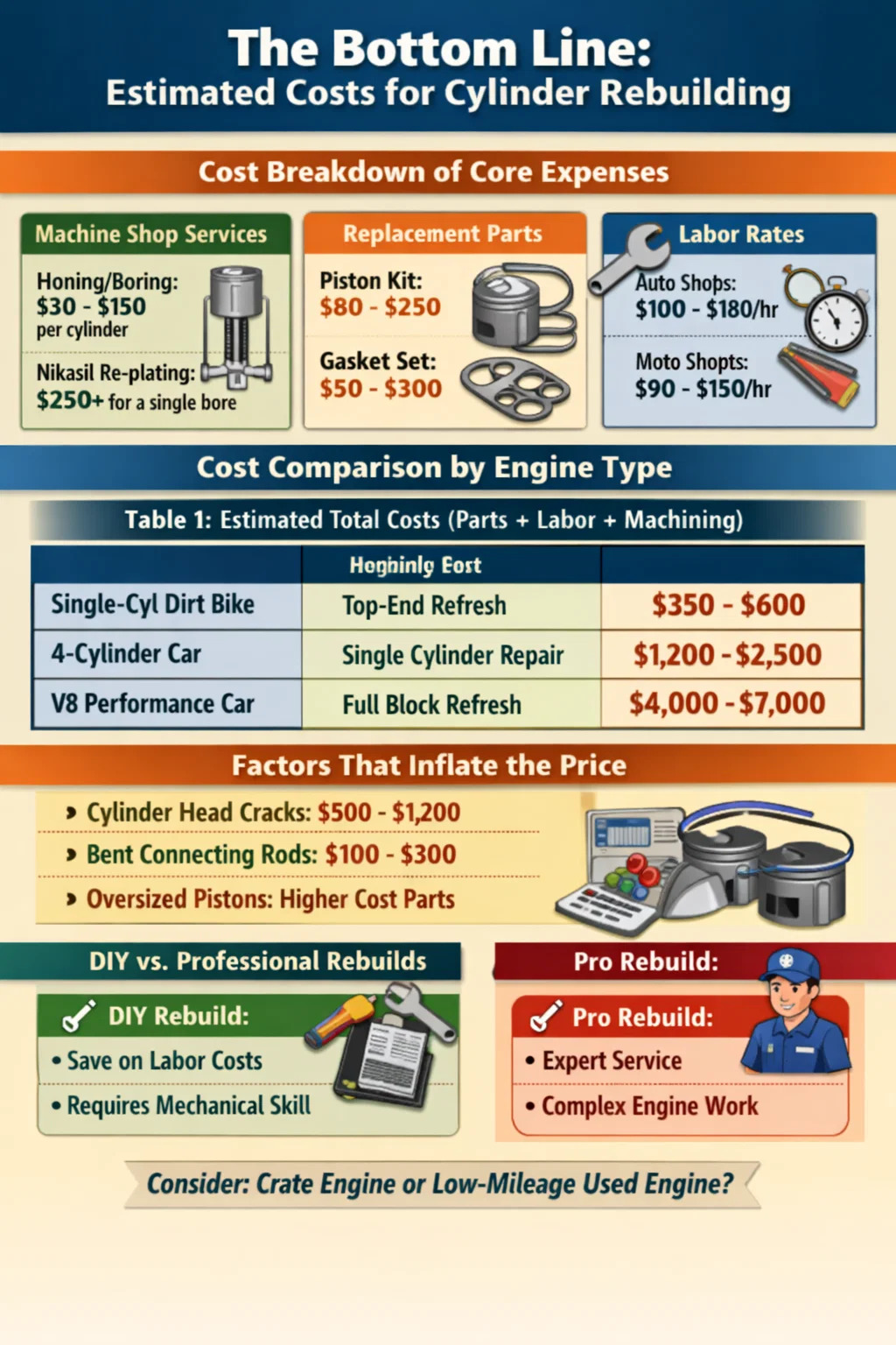 اگر ابزار و دفترچه راهنمای خدمات را دارید، یک بازسازی DIY از یک سیلندر موتور سیکلت روشی مناسب برای صرفه جویی تقریبا ۵۰۰ دلار نیروی کار . شما هنوز باید برای کار دقیق پولی به ماشینفروشی بپردازید، اما شما «کار گریس» را انجام میدهید. با این حال، برای خودروهای مدرن با زمانبندی بادامک بالاسری پیچیده و محفظههای محکم موتور، ابزارهای تخصصی مورد نیاز (زوایای گشتاور، قفل بادامک) اغلب یک فروشگاه حرفهای را ایمنتر، هرچند گرانتر، انتخاب میکنند.