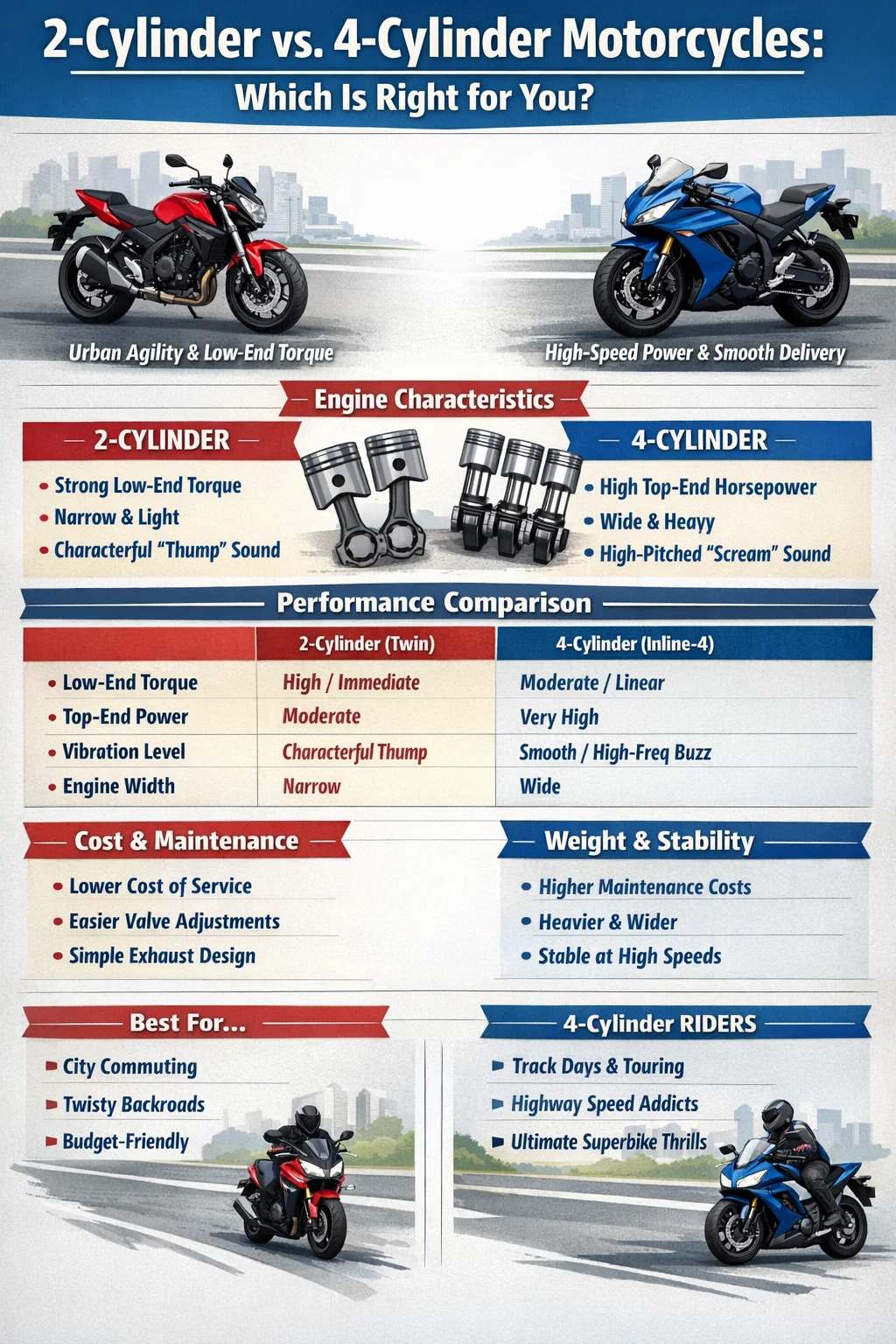 این سوال که آیا یک موتورسیکلت 2 سیلندر یا 4 سیلندر "بهتر" است، پاسخی جهانی ندارد، اما تمایز عملکردی واضح است: یک موتورسیکلت 2 سیلندر از نظر گشتاور پایین، چابکی شهری و ارگونومی باریک برتر است، در حالی که یک موتورسیکلت 4 سیلندر پادشاه بلامنازع پایداری در سرعت بالا، اسب بخار برتر و ارائه قدرت نرم است. اگر سوارکاری شما شامل رفت و آمد در شهر و پیچ و خم های تنگ کوهستانی است، دو سیلندر اغلب تجربه جذاب تری را ارائه می دهند. با این حال، اگر هوس فریاد یک موتور با دور بالا را دارید و وقت خود را در مسیرها یا بزرگراه های طولانی سپری می کنید، چهار سیلندر ارزش وزن و هزینه اضافی را دارد.